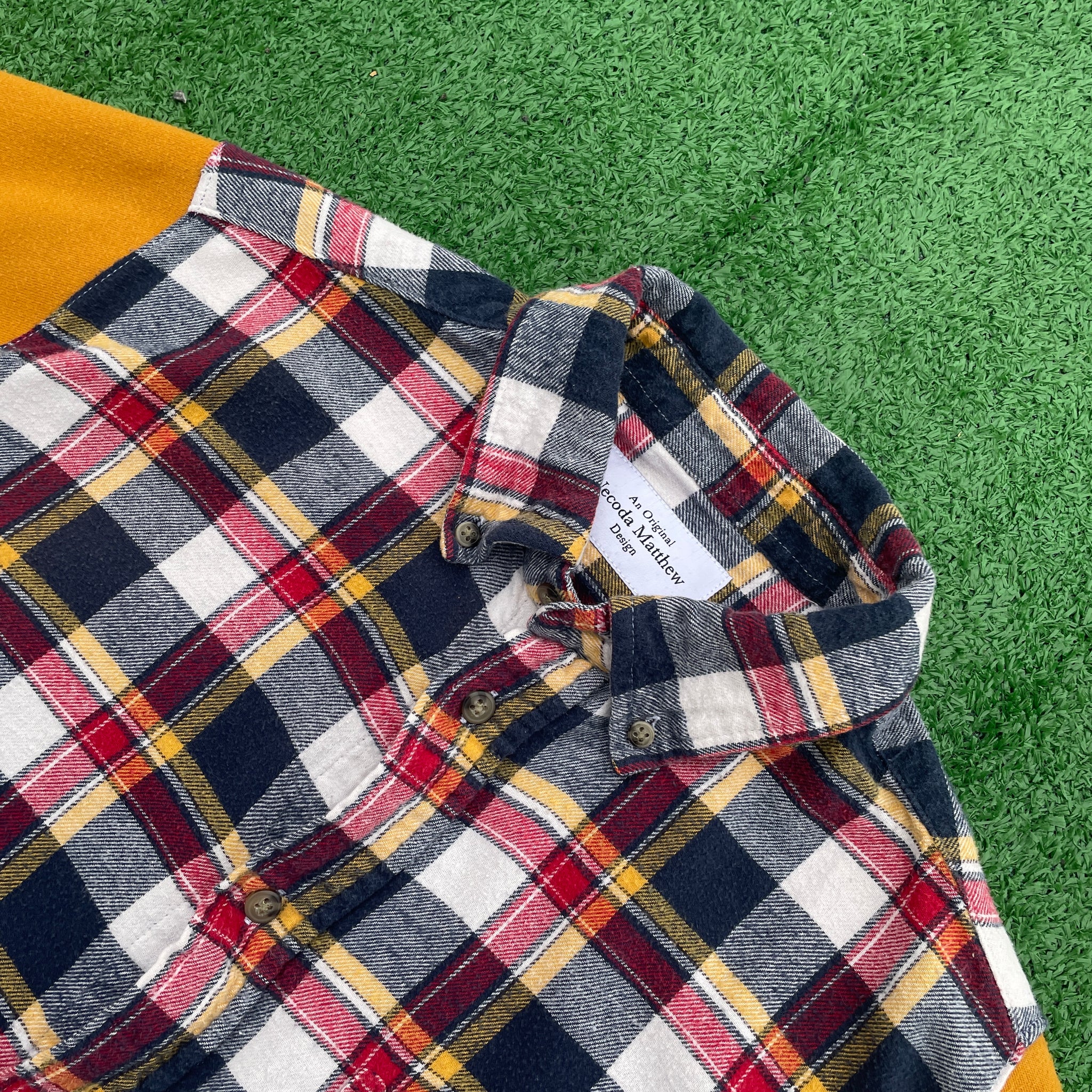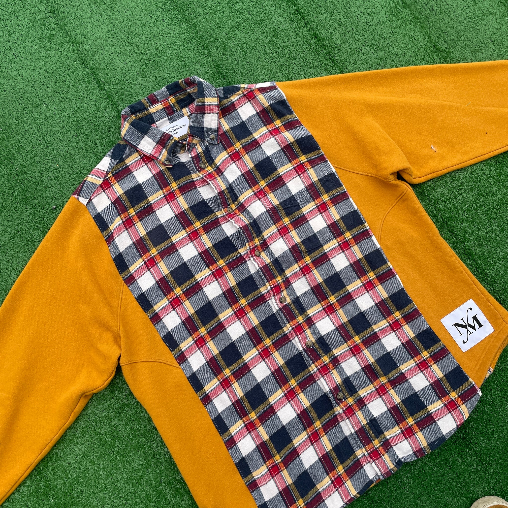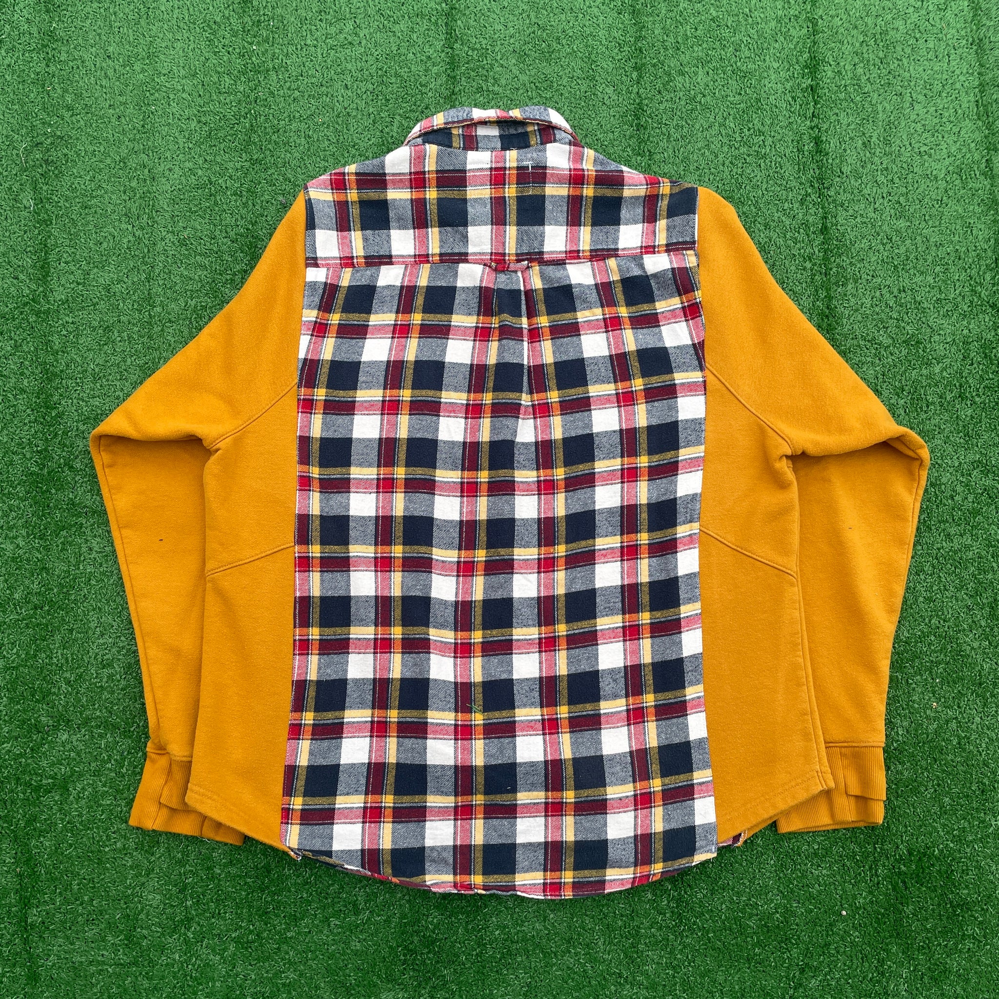 This 1 of 1 design was created from a hand selected thrifted classic cotton sweatshirt and flannel shirt that were all deconstructed and combined into this new sustainable design to created a unique twist on a classic pieces. Triple stitched with overlock and top-stitch accent.