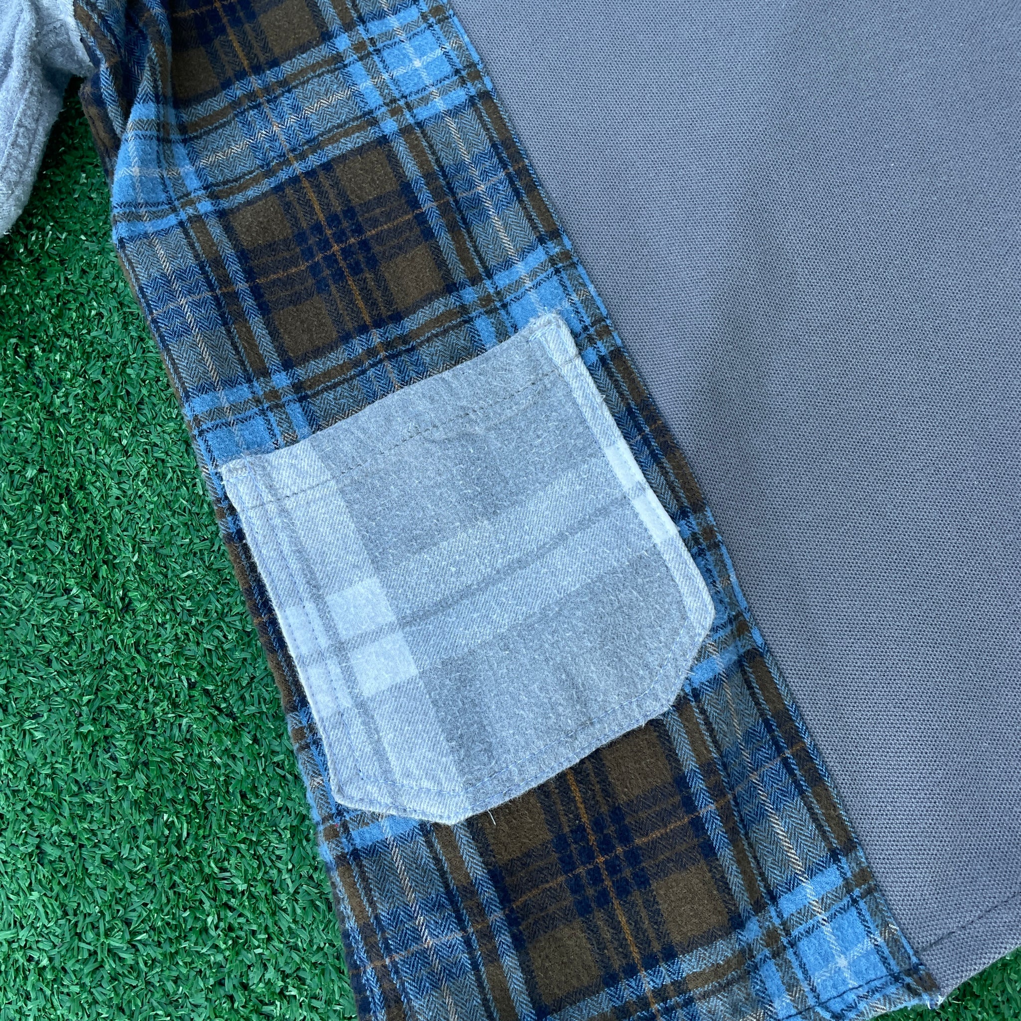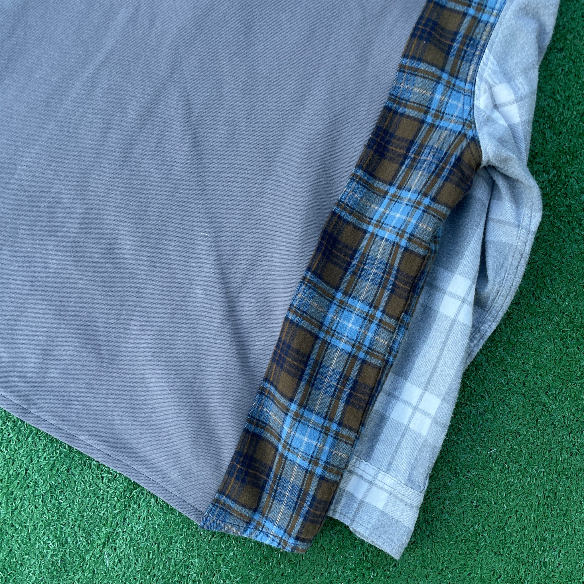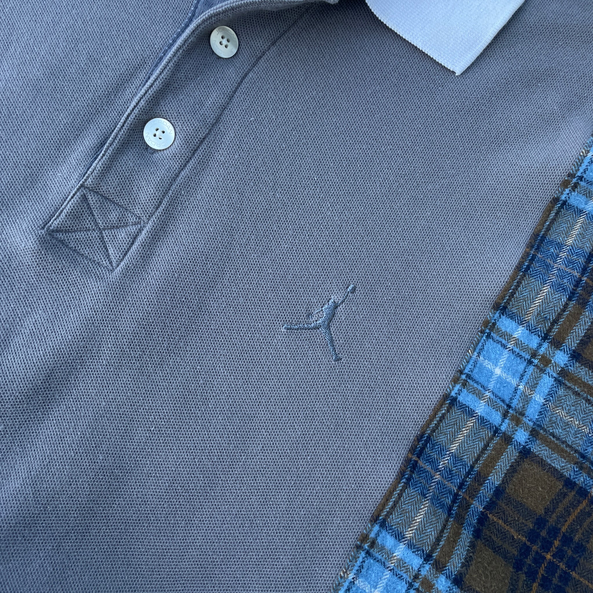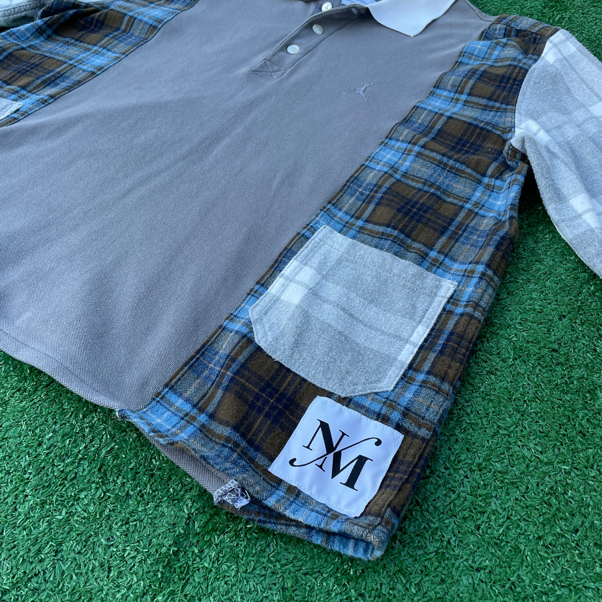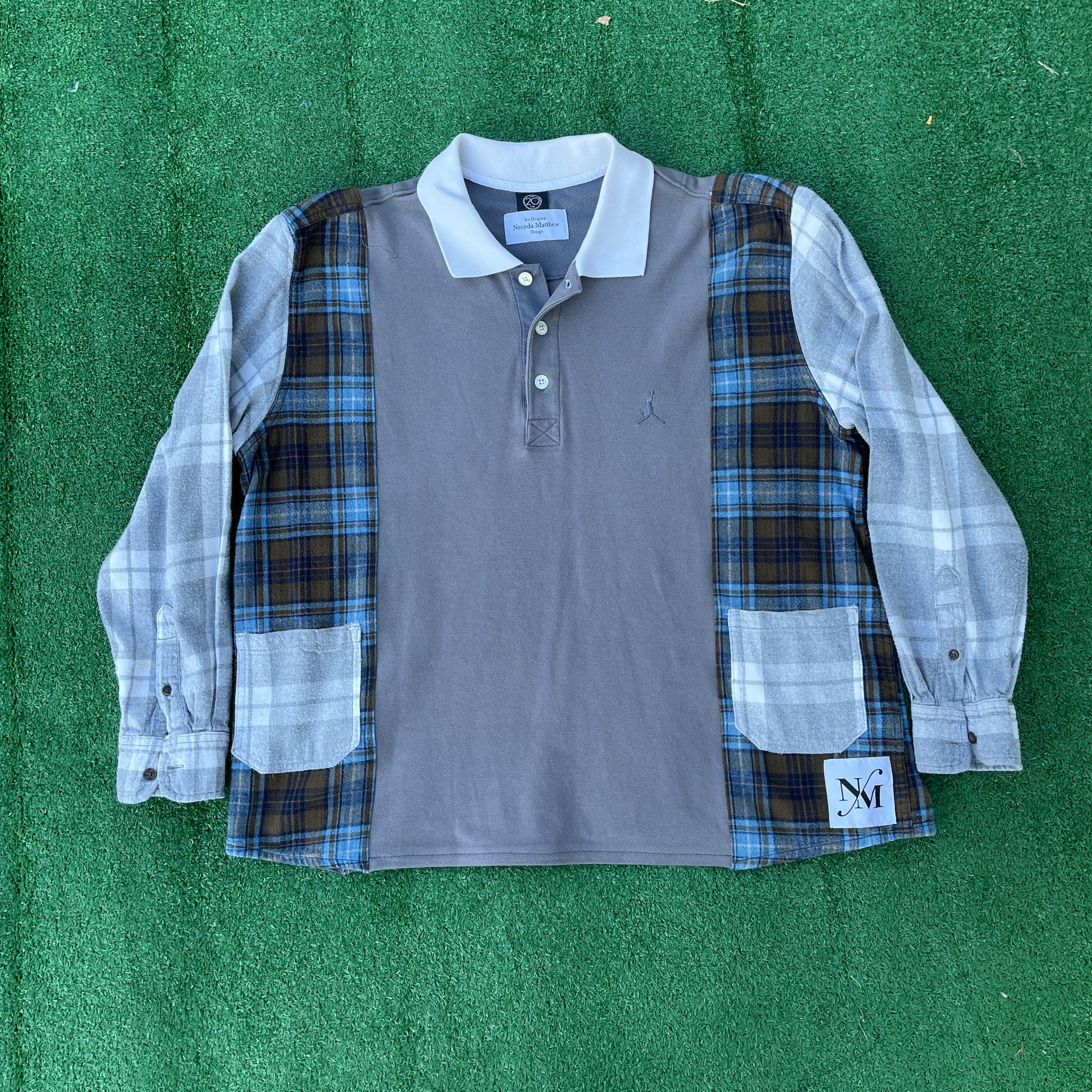 This 1 of 1 design was created from an grey Jordan polo sweatshirt, a flannel, and some spare pants material that were all deconstructed and combined into this new sustainable design to created a unique twist on a classic pieces. Triple stitched with overlock and top-stitch accent.